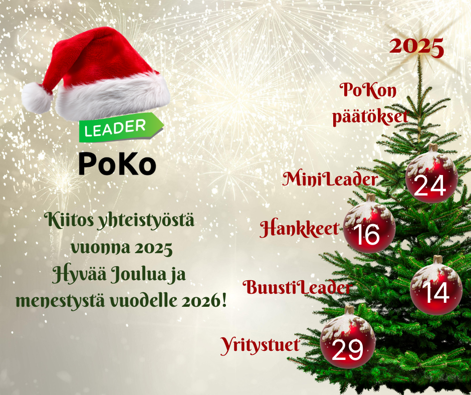PoKo toivottaa kaikille oikein rauhaisaa joulun aikaa. Samalla tahdomme kiittää kuluneesta vuodesta 2025. Se oli Leader-toiminnassa vilkas ja monipuolinen. On hienoa kehittää yhdessä teidän kanssanne entistä ehompaa Ylä-Pirkanmaata. Toivotaan, että vuosi 2026… - Uutiskirje 3/2025