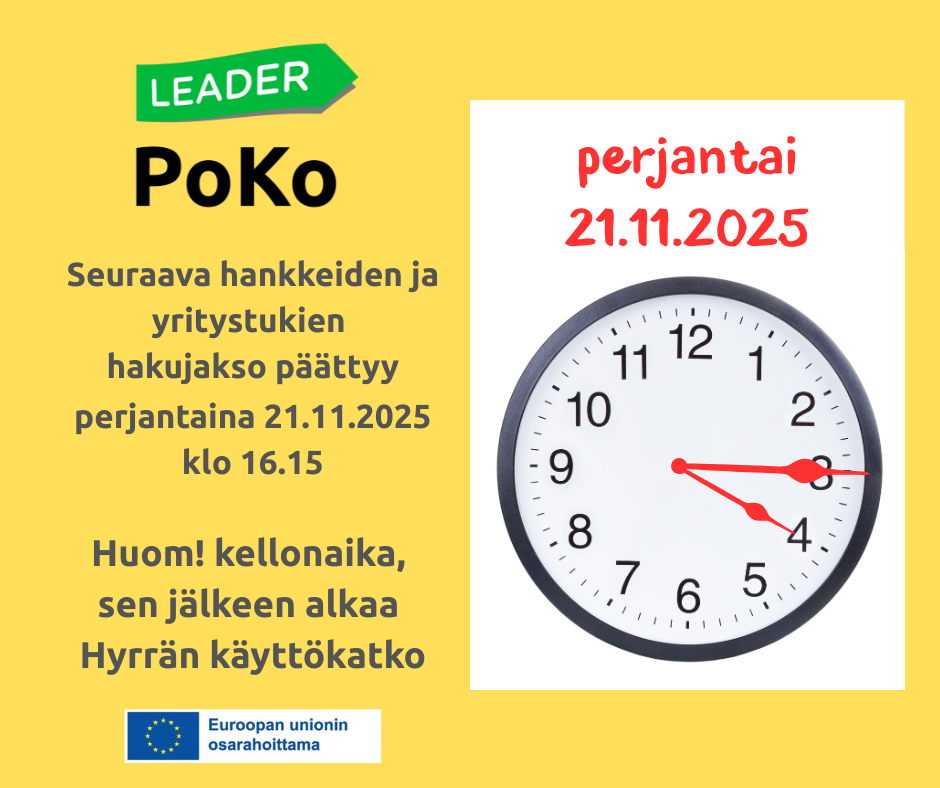 PoKon seuraava ja tämän vuoden viimeinen hakujakso päättyy 21.11.2025. Huomioithan, että Hyrrä sulkeutuu klo 16.15 (käyttökatko). Kysy tarvittaessa apua, neuvoa PoKon toimistolta. - Yhteishankintoja kylätaloille